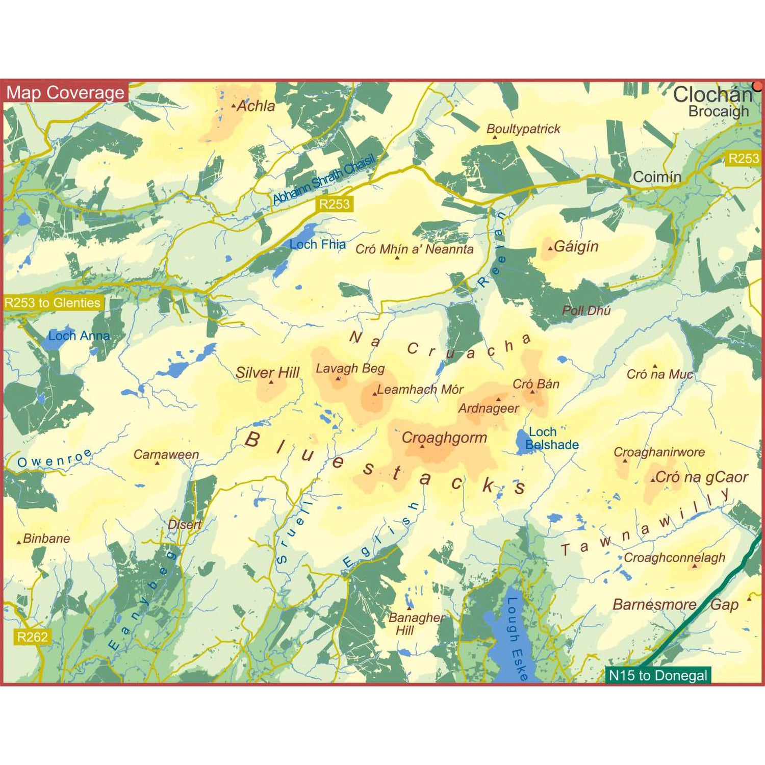 Definitive detailed map at 1:25,000 scale covering the Bluestack Hills just north of Donegal town. A very detailed wild and rugged landscape full of challenges. Produced to our 25Series standard, this general topographic map has a 5 metre contour interval for fine navigation. Detailed topographic map with many local placenames recorded.