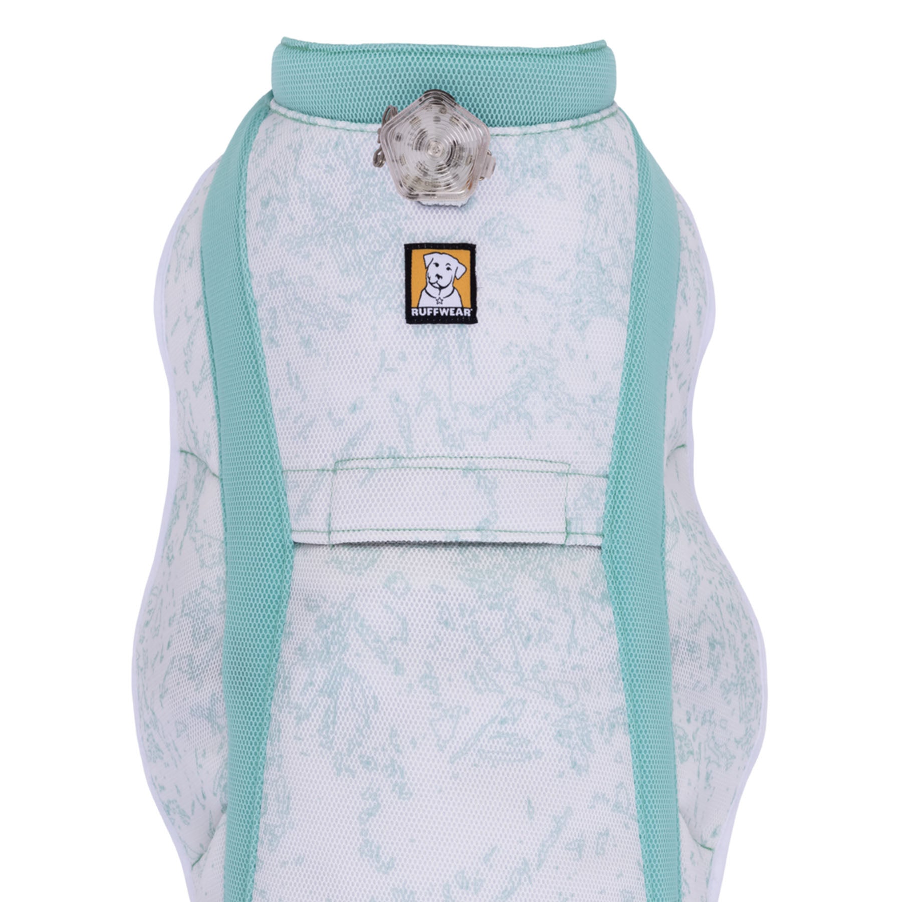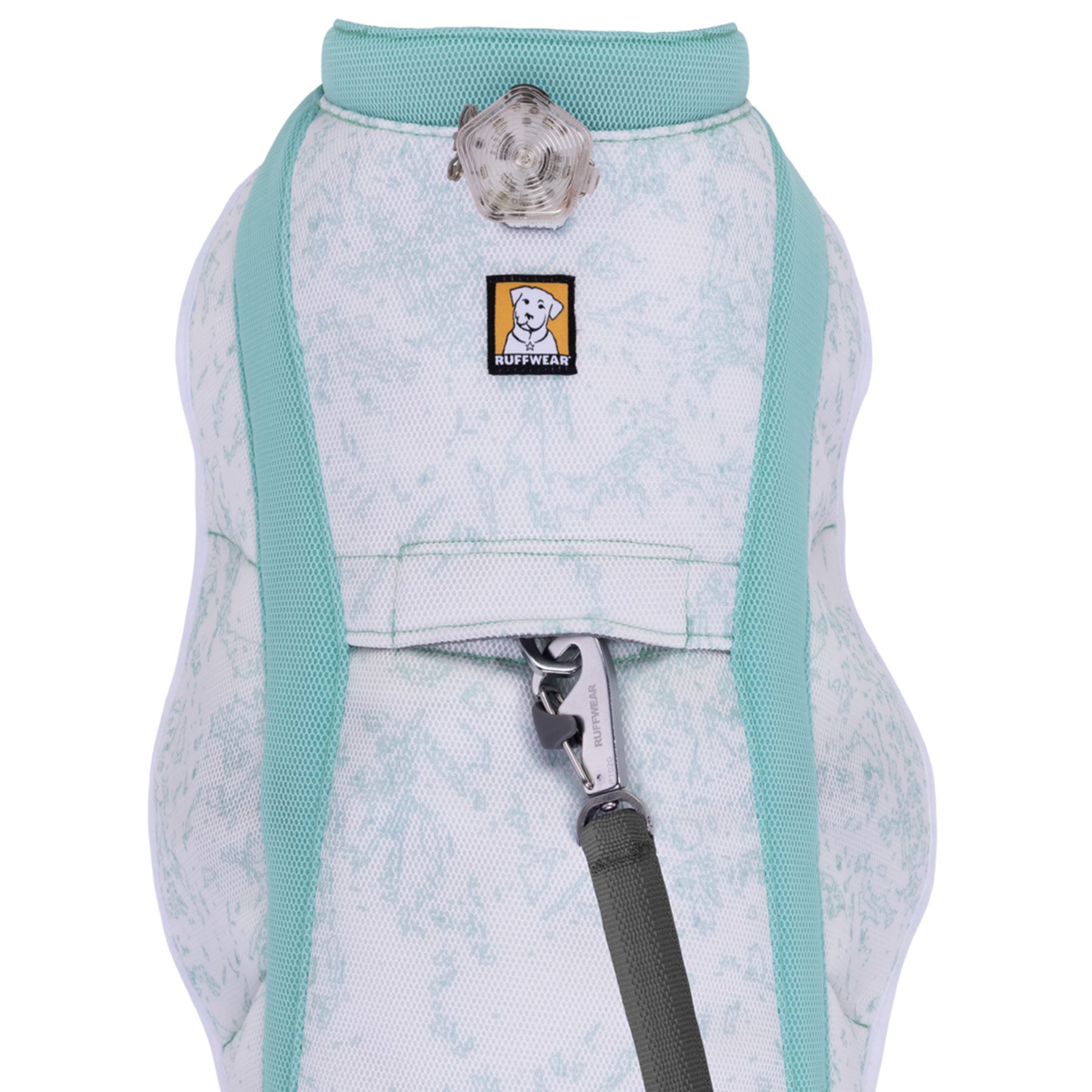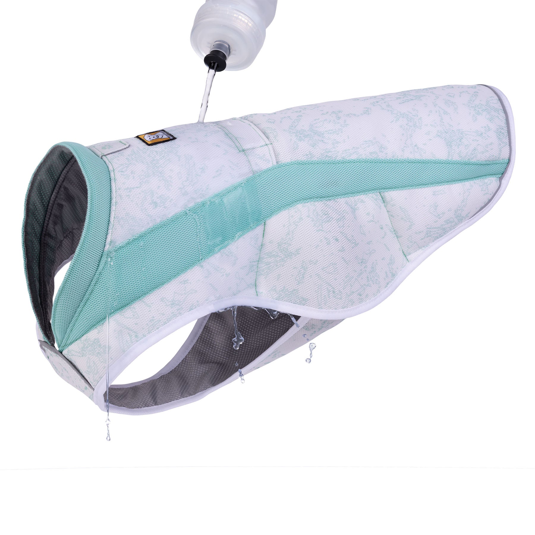 The Swamp Cooler Vest includes side-release buckles for easy on/off and a leash portal so it can be worn over a harness.